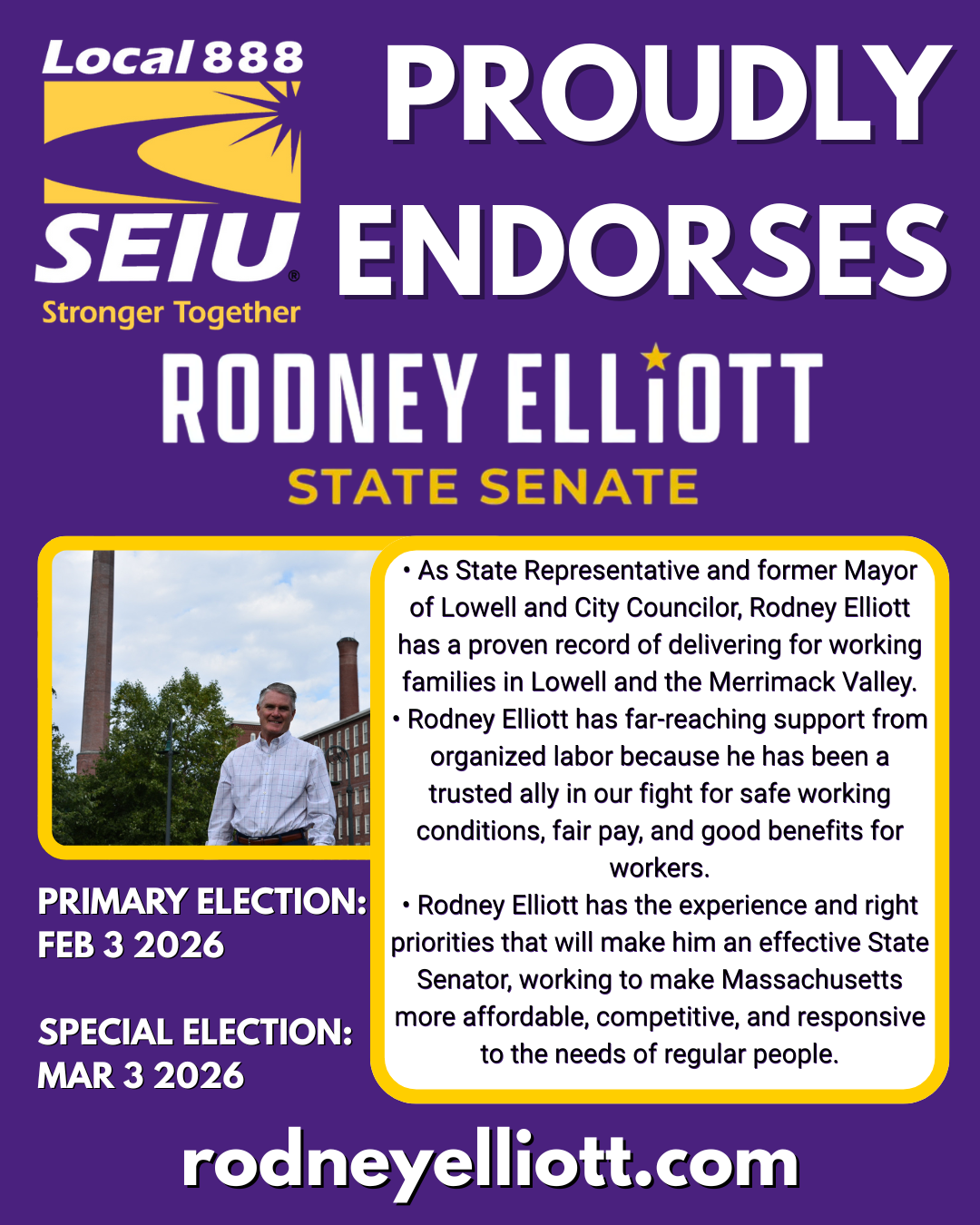 SEIU Local 888 Proudly Endorses Rodney Elliott in the upcoming Lowell State Senate Special Election, Feb 3 2026