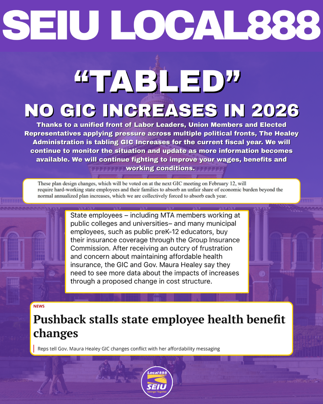 Thanks to a unified front of Labor Leaders, Union Members and Elected Representatives applying pressure across multiple political fronts, The Healey Administration is tabling GIC Increases for the current fiscal year. We will continue to monitor the situation and update as more information becomes available. We will continue fighting to improve your wages, benefits and working conditions.